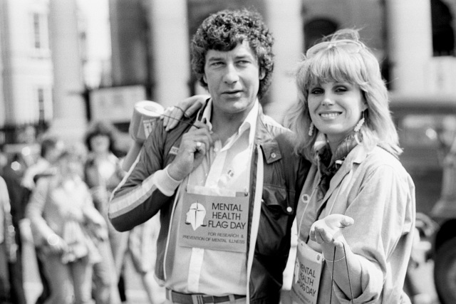 Gareth Hunt and Joanna Lumley on the streets of London selling flags in aid of Mental Health Week on May 10, 1978
