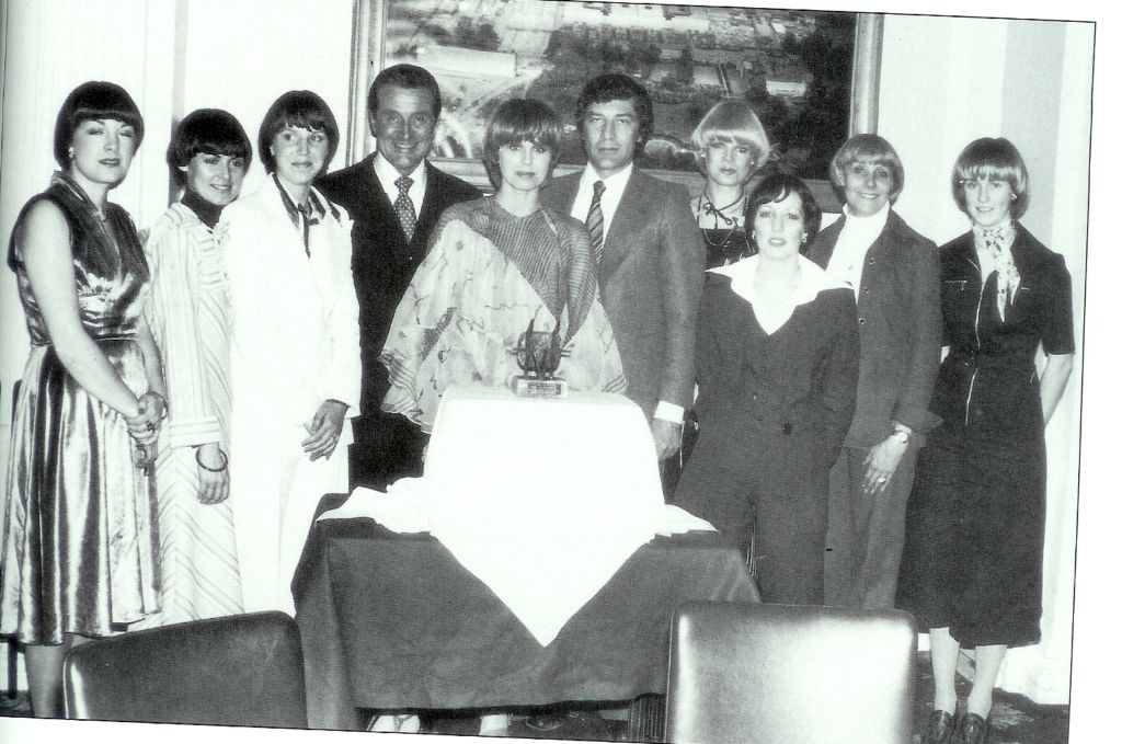 Gareth Hunt and Joanna Lumley pose with participants in the Purdey lookalike competition in April 1977